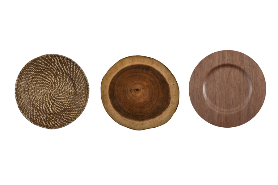 - Natural woods and rattan details, like our Walnut Charger, Wood Slice Charger or Rattan Charger (Seattle exclusive)