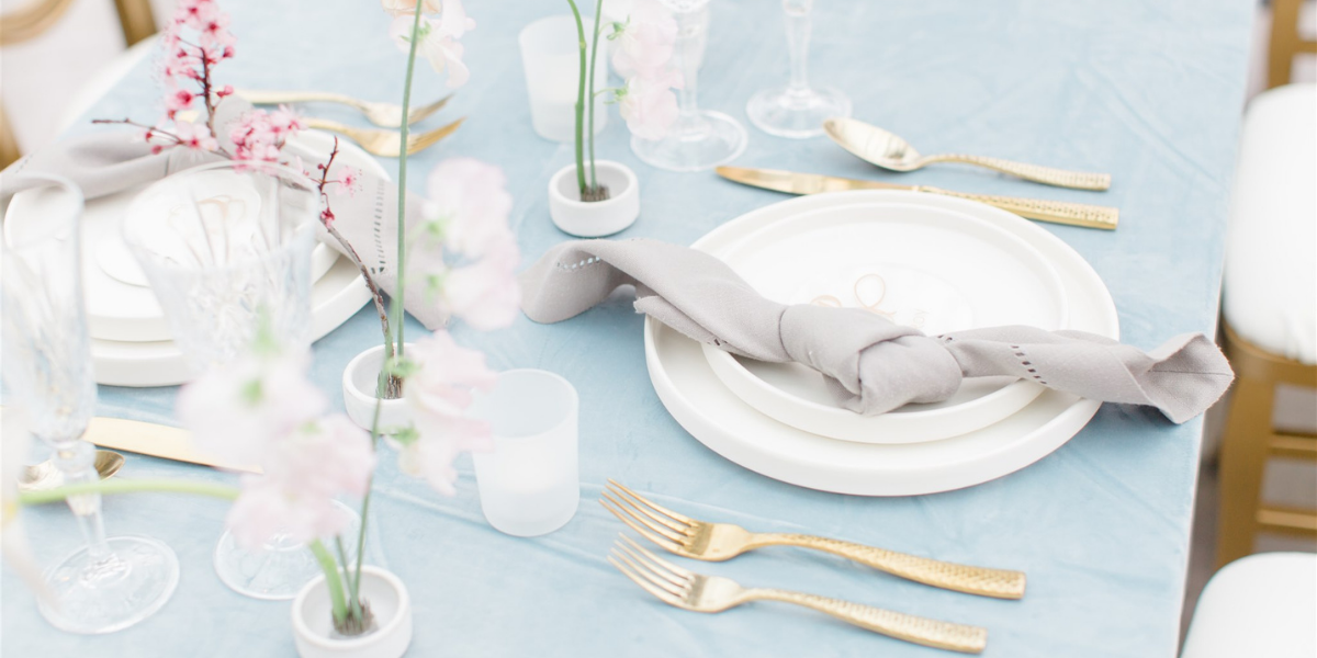 August Skies Weddings put together this dreamy design inspired by early spring in the Pacific Northwest. It features a color palette with muted dusty gray-blues and pops of peaches and pinks, which reflect the beautiful blooms that follow spring rainfall.