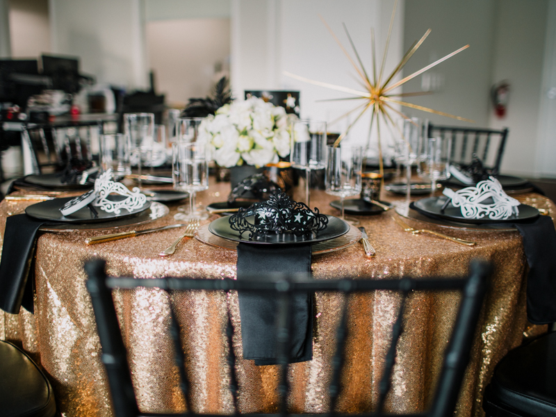 Black plates, black napkins and black chairs were used to add pops of contrast and create a feeling of mystery. Our friends at Christopher J Design provided the décor, which included masks, feathers, candle holders and a giant gold star. Every piece of the design fit together perfectly.