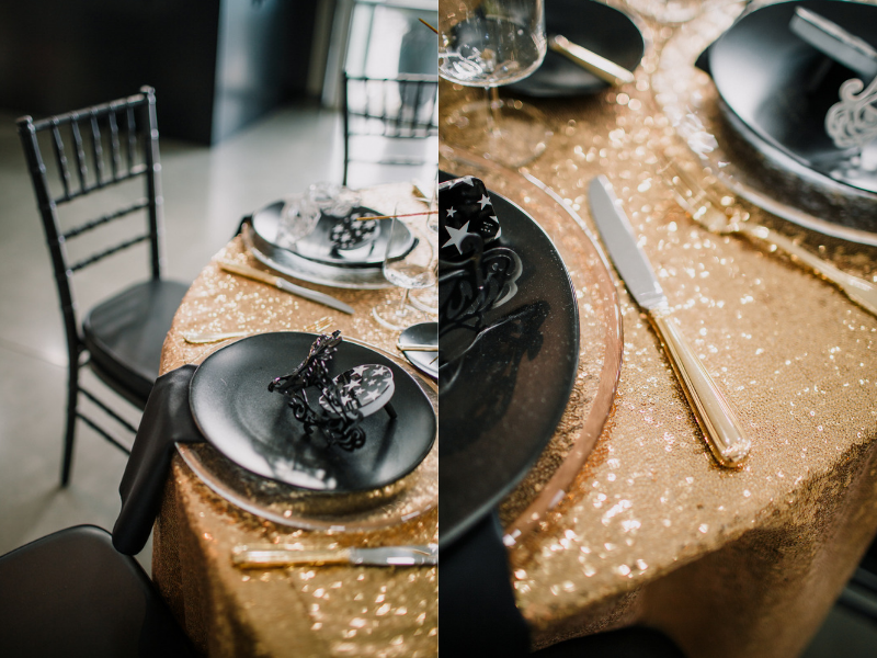 We went with Gold Glass Sequin Linen as it’s glamorous and reflects light to make everything sparkle! To add to the feeling of opulence, gold flatware and Gold Rim Glass Charger Plates were used. The transparent chargers let the sequins shine through while their subtle gold rim helped tie things together.
