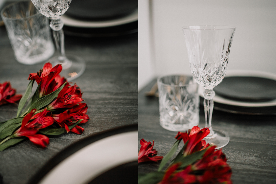 To add to the bold and romantic theme, we opted for a Black Hemstiched Dinner Napkin. There's something beautifully moody about the gold and black flatware on the black napkin.