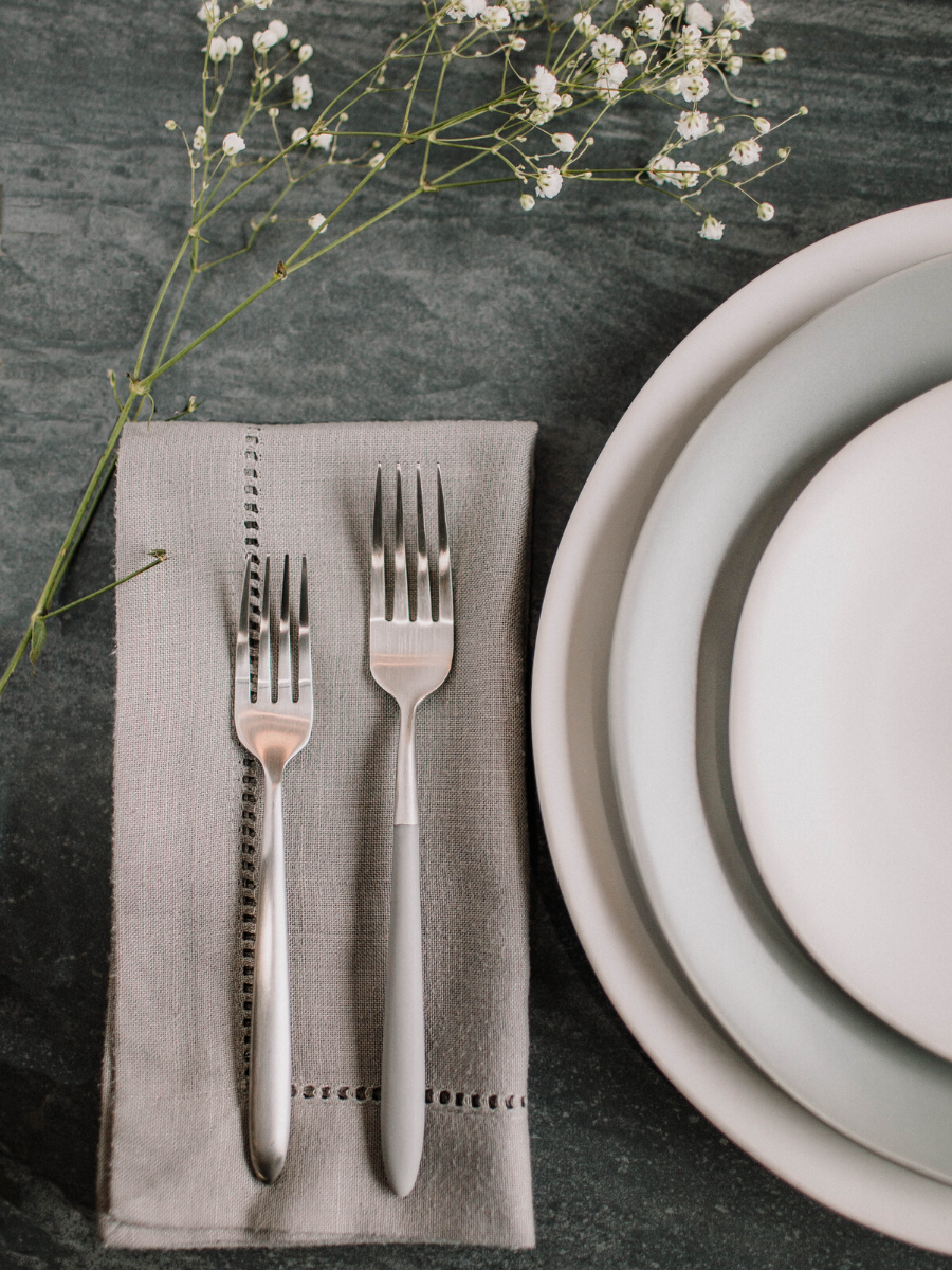 Lastly, we opted for a Grey Hemstitched Linen Napkin, which tied in the grey from the flatware and the grey plate. All of the elements combine to create a design that is light, unique, and dreamworthy!