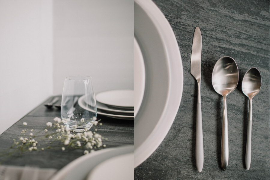 To maintain the calm feel of the design, we mix matched Brushed Silver Velo Flatware with Silver/Grey Velo Flatware. When combined, their differences are subtle but beautiful, and they add a feeling of elegance to the table.